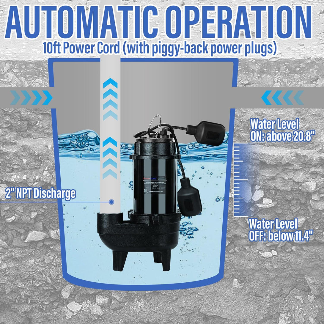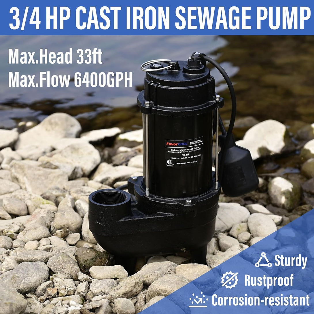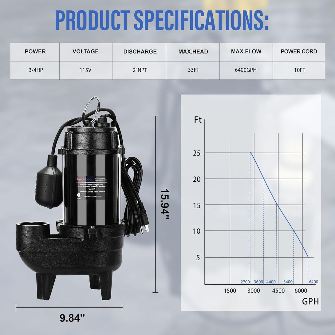 - 💧EXCELLENT PERFORMANCE: FavorCOOL 3/4HP submersible sewage pump elevates water to a maximum of 33ft vertically, capable of pumping up to 6400 gallons per hour, perfect for residential sewage systems. The efficient copper motor with thermal overload protection and low noise ensures secure and excellent performance. Whether it's a heavy downpour or snow melting causing excess water, our sewage ejector pump is your best bet for keeping your basement dry at all times!