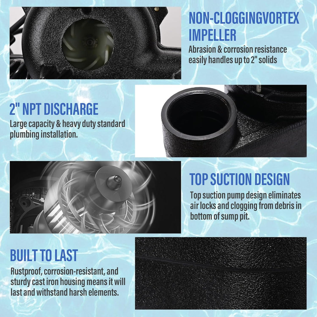 - 💧TOUGH AND DURABLE: This heavy-duty basement sump pump is constructed with a rugged cast iron casing with a rust-proof surface to ensure a long service life in harsh sump pump applications. Reinforced engineered non-clogging vortex impeller and 2'' NPT discharge allow the sewage grinder pump to handle solid particles up to 2" diameter solids. submersible effluent pumps have an IP68 waterproof, it's ideal for basements or below grade installations.