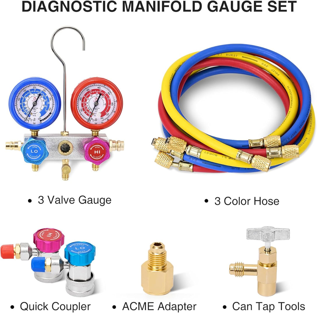 - HIGH ACCURACY AC GAUGES - The manifold AC gauge set is excellent for diagnosing and repairing AC systems. Ideal use for R22, R134a, and R410a, our charging hoses are made by 100% Virgin Teflon Diaphragms with the highest industry standards, fit the high-pressure requirements for charging R410A, Working Pressure 800psi, Brust Pressure 4000psi. Much higher and safer than most other products on the market.