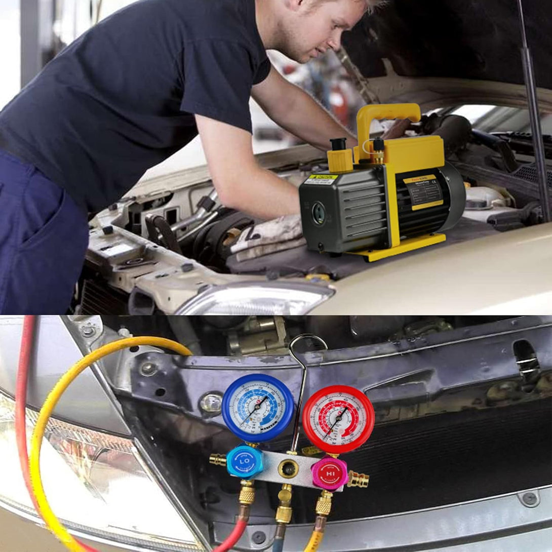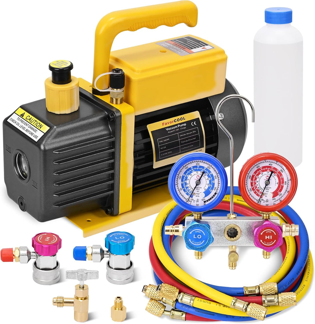 - EFFECTIVE SERVICE SET - FavorCOOL ac vacuum pump and gauge set, includes a powerful 1/4 HP vacuum pump, 3-way gauge, 3 color-coded 4ft hoses for R410a recharging, 2 adjustable 1/4'' aluminum made quick couplers, plus a brass tank adapter and a can tap 1 bottle of 300ml vacuum oil is also included for easy refrigerant evacuation, restoring, and other automotive AC repair work
