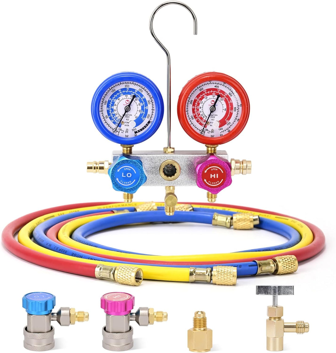 - HIGH ACCURACY AC GAUGES --- The manifold AC gauge set is excellent for diagnosing and repairing AC systems. Ideal use for R22, R134a, and R410a, our charging hoses are made by 100% Virgin Teflon Diaphragms with the highest industry standards, fit the high-pressure requirements for charging R410A, Working Pressure 800psi, Brust Pressure 4000psi. Much higher and safer than most other products on the market.