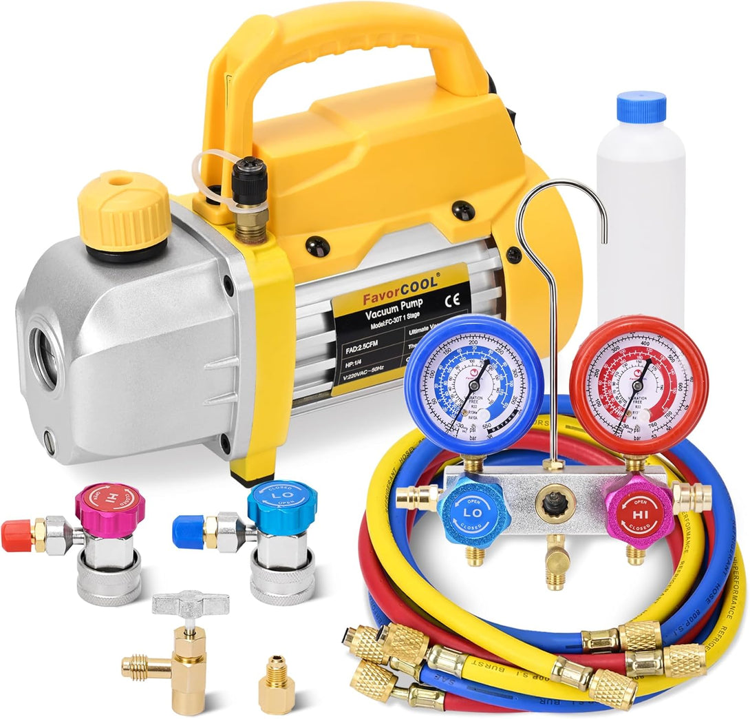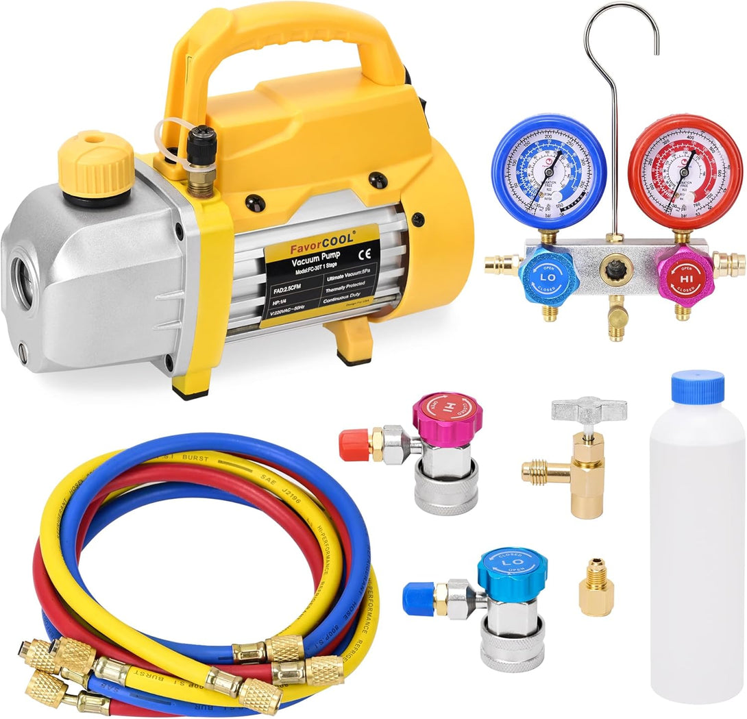 - EFFECTIVE SERVICE SET --- FavorCOOL ac vacuum pump and gauge set, includes a powerful 1/4 HP vacuum pump, 3-way gauge, 3 color-coded 4ft hoses for R410a recharging, 2 adjustable 1/4'' aluminum made quick couplers, plus a brass tank adapter and a can tap 1 bottle of 170ml vacuum oil is also included for easy refrigerant evacuation, restoring, and other automotive AC repair work