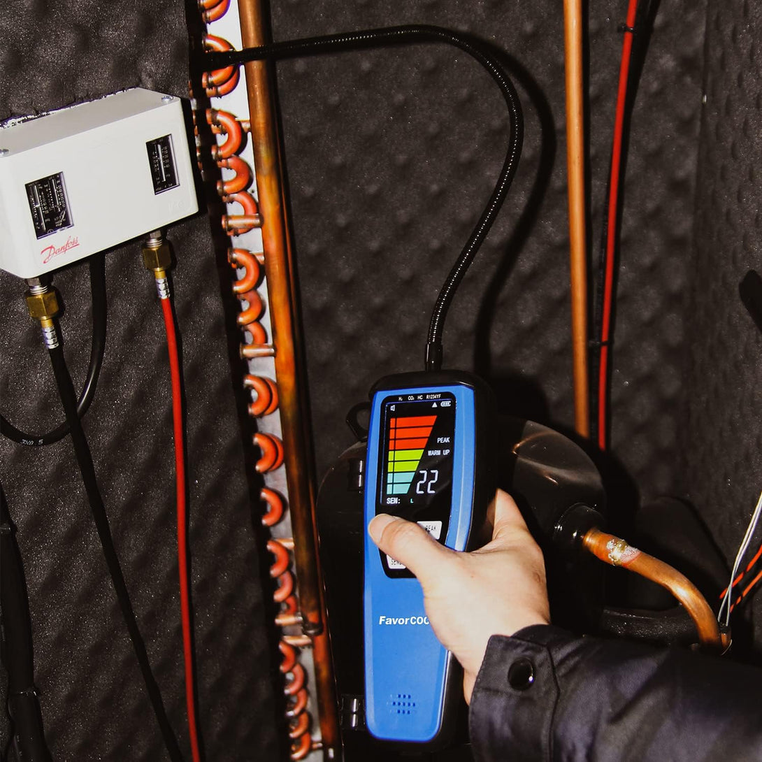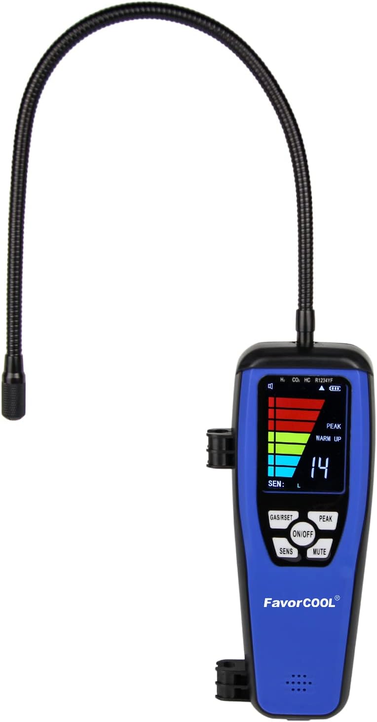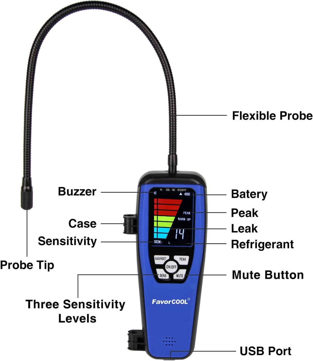 - Advanced Heated Diode Sensor: The Freon leak detector is equipped with High-precision heated diode sensor with less interference from other gases (compared to corona sensor). It can quickly identify all halogenated refrigerants including CFCs, HFCs, HCFCs, HCs, HFOs and mixed refrigerants such as R11/R22/R404a/R410a/R600a/R1234yf
