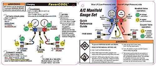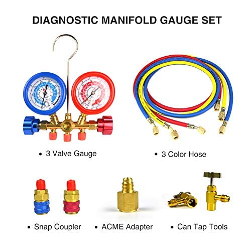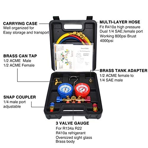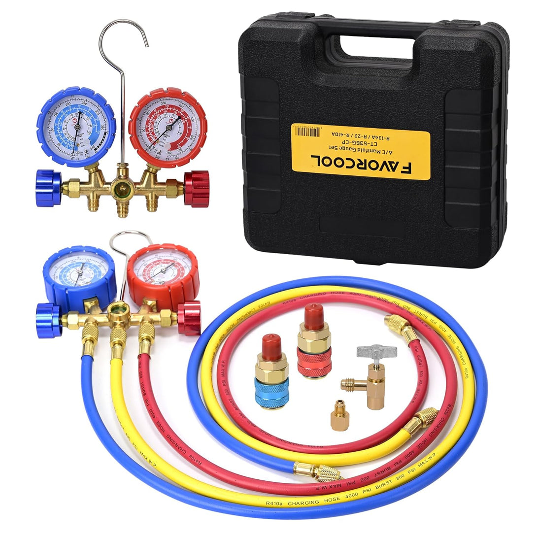 - COMPLETE GAUGE SET: The FavorCOOL multi-functional AC diagnostic manifold gauge kit is the complete package for all of your AC freon charging, evacuation, diagnostic check and recovery needs for both automobiles and homes. The kit includes a 3-way gauge, 3 color-coded 4ft hoses suitable for R410a recharging, 2 adjustable 1/4'' snap-in quick couplers, a brass tank adapter, and a can tap all stored in a portable plastic hard case. This professional 3 valve air conditioning diagnostic manifold gauge set is completely compatible with R134A R410a R22 R502 refrigerants.