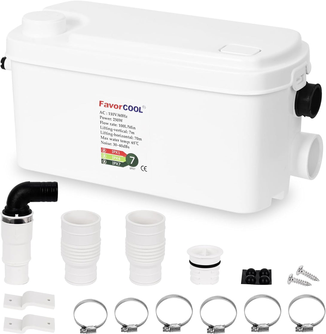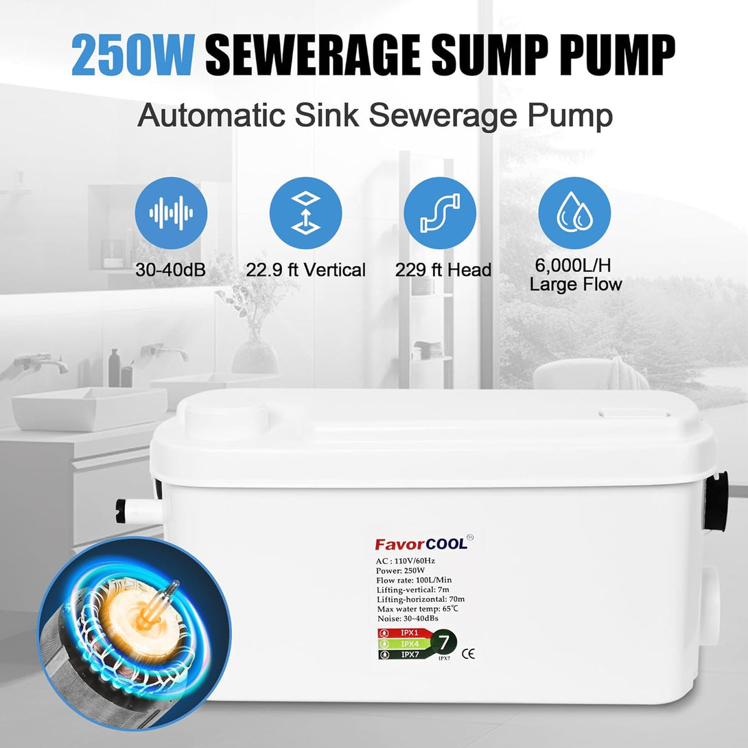 - A FULLY AUTOMATIC AND MAINTENANCE-FREE SINK PUMP: 250W | 110V-120V/60Hz | 26 ft Vertical/262 ft Horizontal | 2800 RMP. FavorCOOL Sink Pump is a home-using compact automatic sewage lift pump designed to pump clear waste water (without solid contents) to a nearby outlet where waste water can not be introduced directly into the sewer system by gravity. With a max head of 26 feet and a max flow rate of 100L /Min, it is perfectly designed for off-grid residential sewage systems.