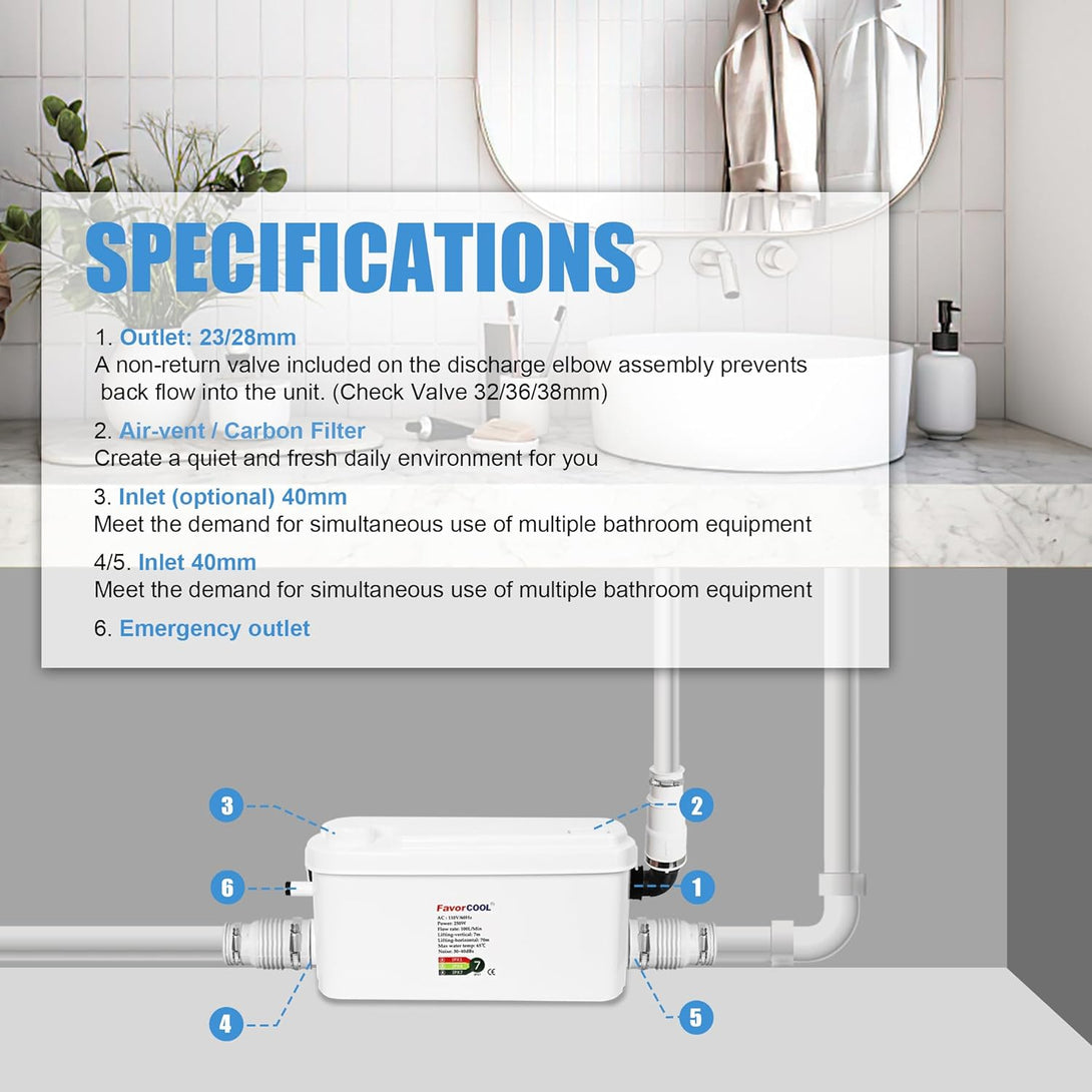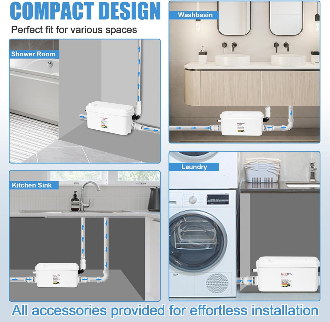 - ONE PUMP FOR ALL: The FavorCOOL sink pump overall dimensions are L 11.2” x W 5.1” x H 8.6”, compact structure, suitable for most shallow spaces, and perfect for under-basin installation. This sink pump is equipped with 3 built-in Ø 40mm universal side waste water inlets that can connect to a bathtub, basin, shower, laundry, kitchen, lavatory, or any other kind of sink.
