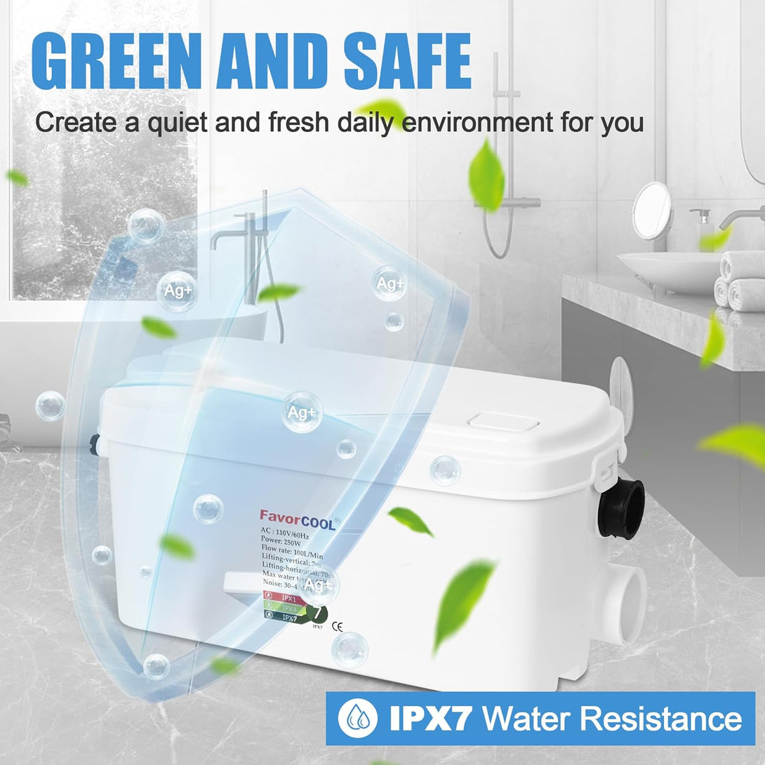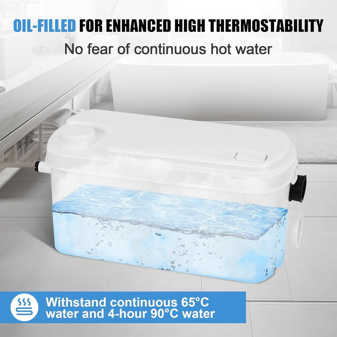 - GREEN AND SAFE: The working noise of this sink sewage pump is 30-40 dB, quiet and smooth to operate to not affect your sleep. The replaceable activated carbon module makes sure the sink pump is odor-free and keeps a fresh air environment for your home. Premium PP material constructed outer shell is anti-aging, anti-scratch, and easy to clean. IPX7's waterproof design ensures a long lifespan even in challenging environments.
