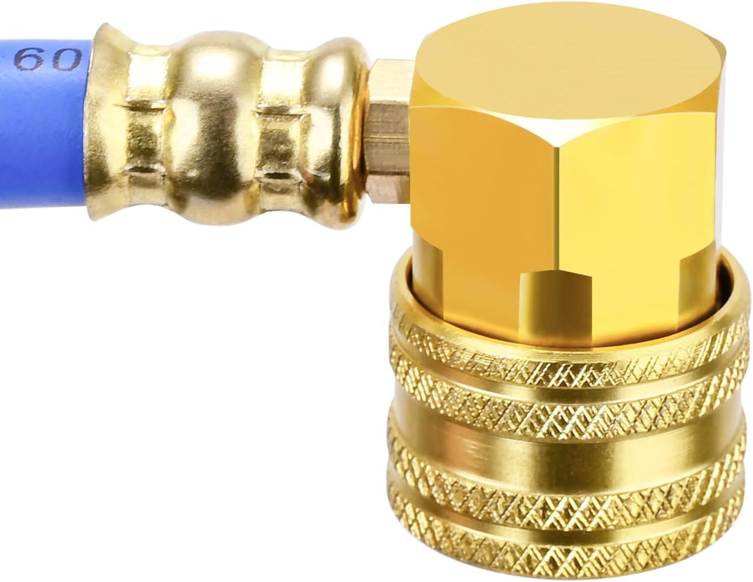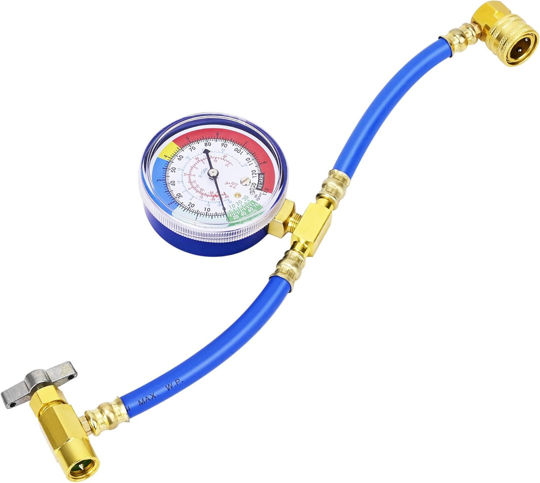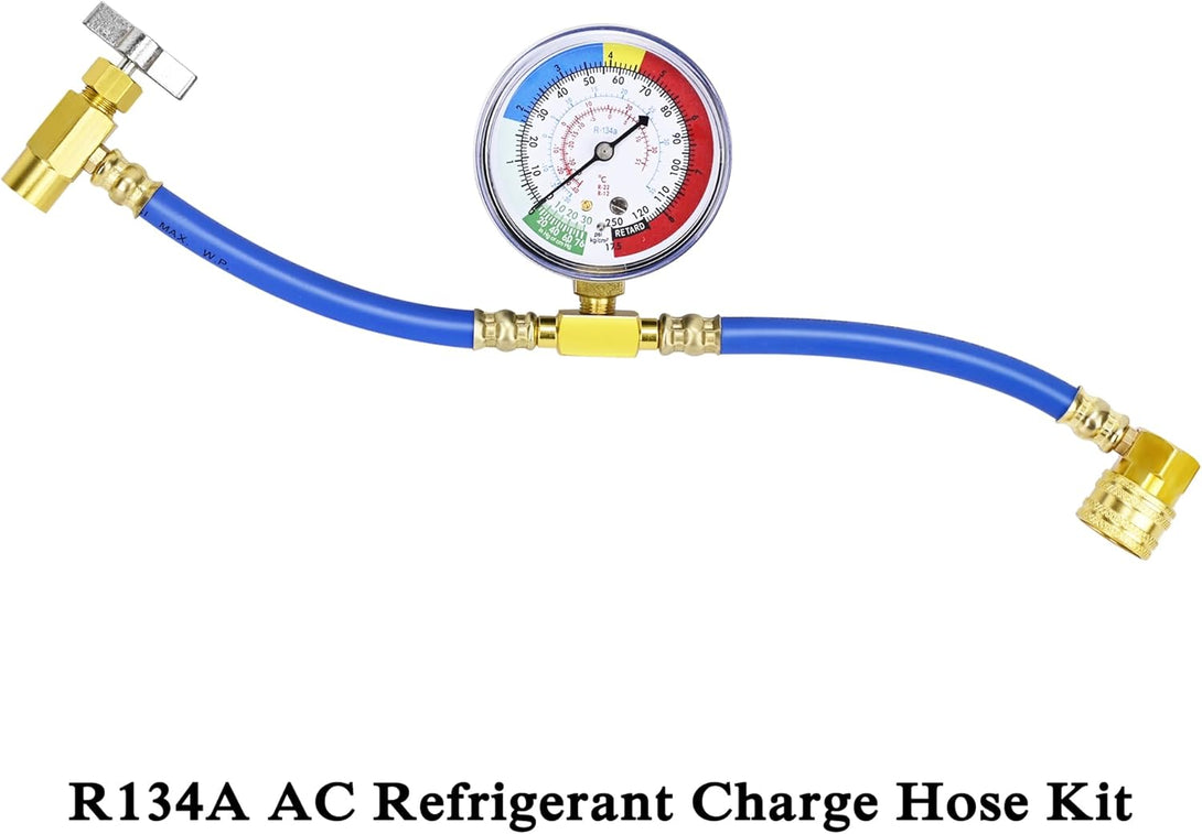 - ❄️【PREMIUM QUALITY】Experience a longer and more durable refrigerant charging hose with our product. R134A can tap valve and R134A low side quick coupler is made of high quality aluminum alloy, for high heat resistance durability and safety. Extra large and colored dials with celsius scale are easy to read, gauge rated 250psi (blue) max pressure, hose rated 3000 psi burst pressure, and 600 psi max working pressure.