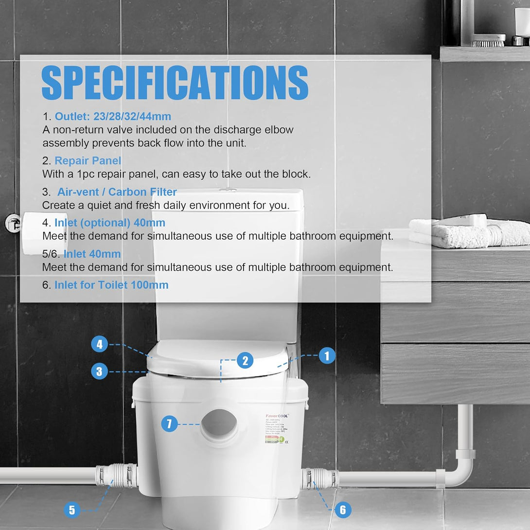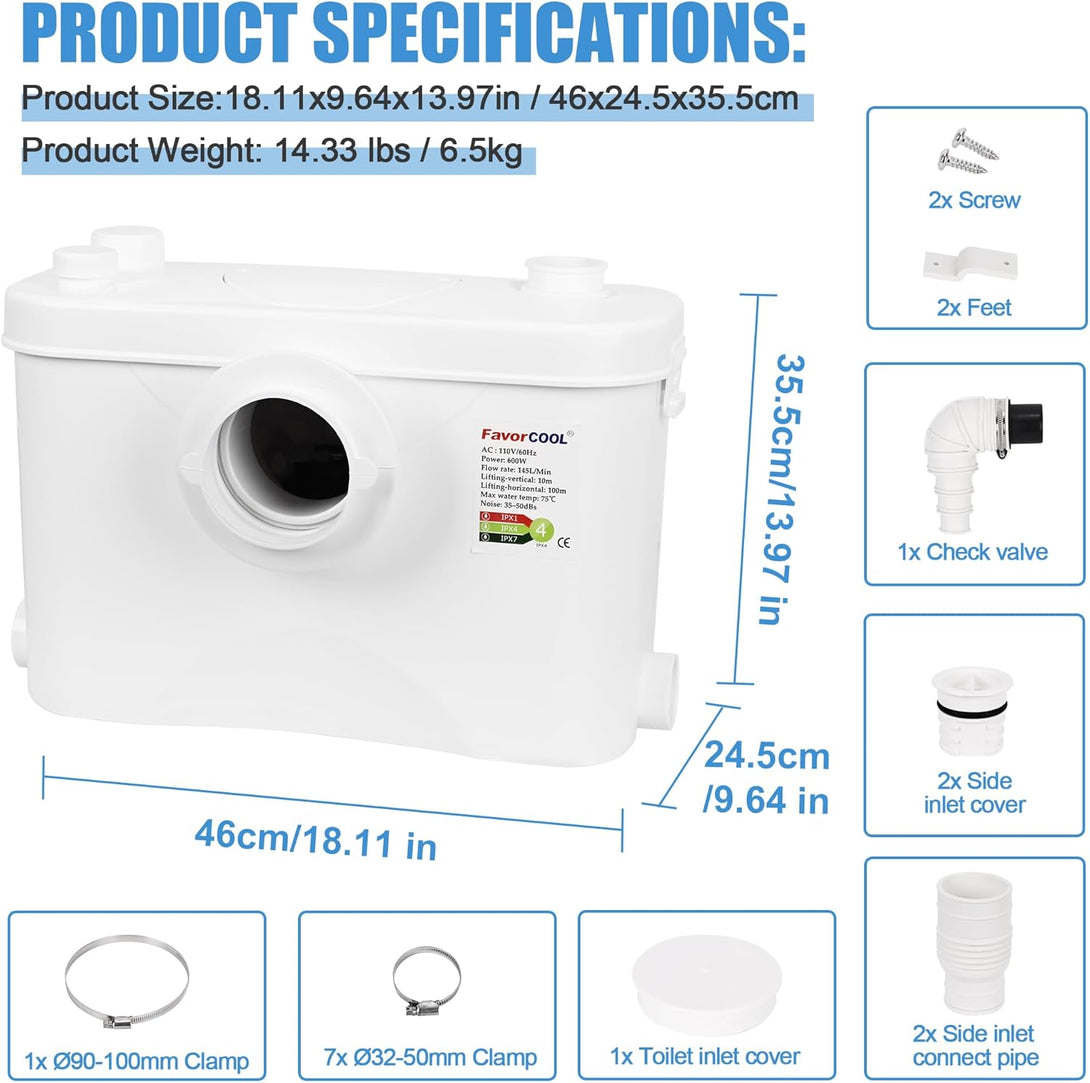- 🚽GREEN AND SAFE: The working noise of this macerator sewage pump is 35-50 dB, providing quiet and smooth operation that won't disturb your sleep. The replaceable activated carbon module makes sure the sewage pump is odor-free and keeps a fresh air environment for your home. Premium PP material constructed outer shell is anti-aging, anti-scratch, and easy to clean. IPX4 waterproof ensures maximum safety for our customers in any environment.