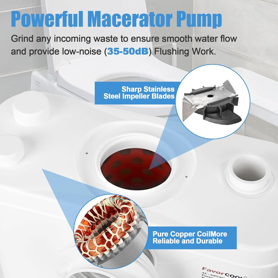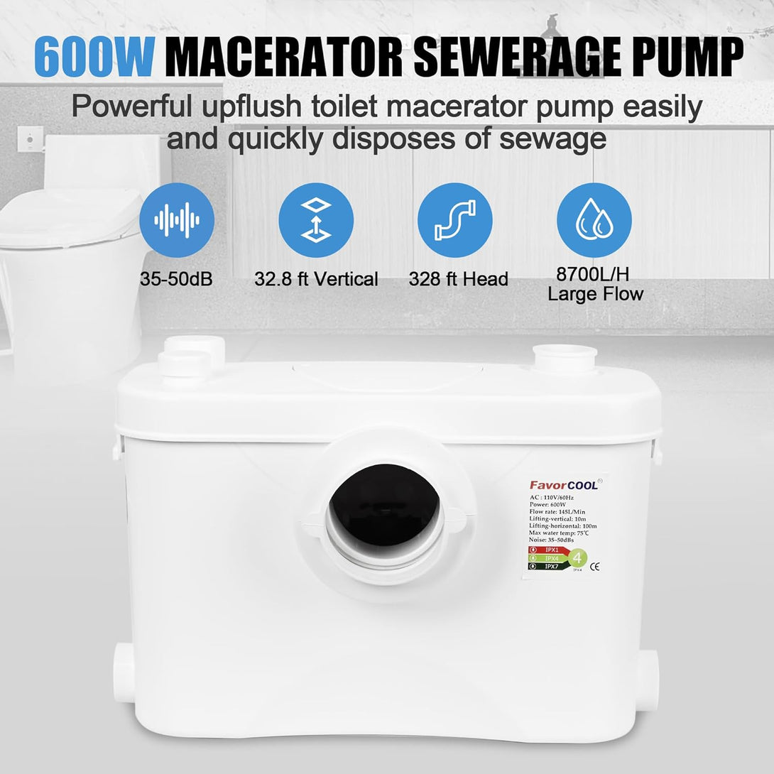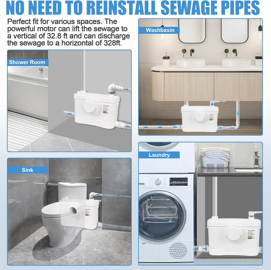 - 🚽 FULL BATHROOM ANYWHERE: 600W | 110V-120V/60Hz | 32.8 ft Vertical/328 ft Horizontal | 2800 RMP. A fully automatic and maintenance-free macerator uplifting pump that is exclusively designed for grinding and pumping waste water and soft matter from toilets, washbasins, showers, laundry, kitchen, and urinal sinks located in basements or in areas where sewage system is not available. It provides a full bathroom solution for house renovation without big modifications to the sewage system.