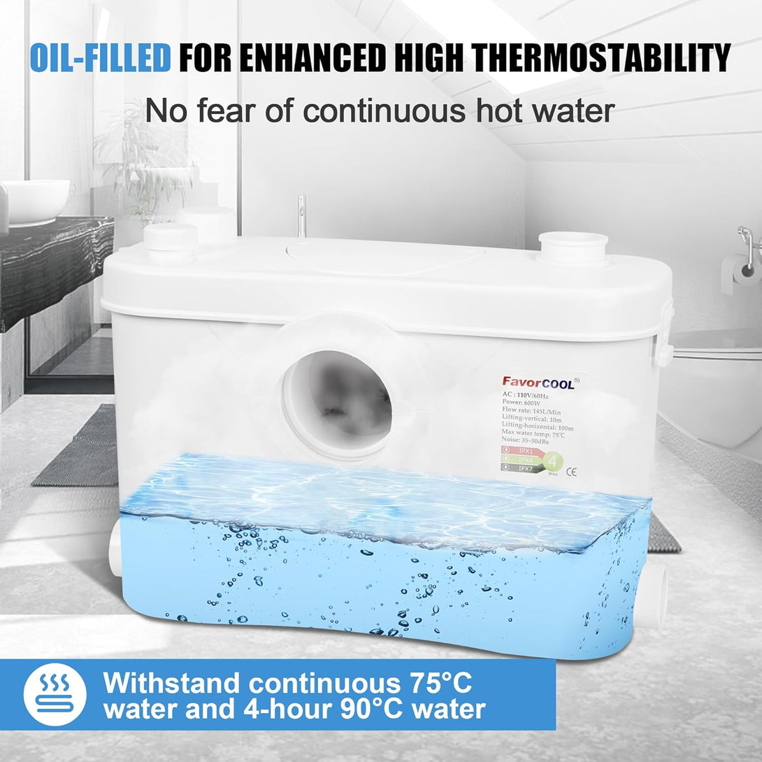 - 🚽 600W POWERFUL MACERATOR PUMP: At the core of this macerator pump is a powerful 600 Watt motor, which coil set is made by full copper, and the motor is oil-filled for enhanced protection, The motor is capable of withstanding continuous water temperatures up to 75°C, or up to 4 hours at 90°C without the need for additional thermal protection. Our macerating pump has better performance and longer life, and boasts exceptional resistance to high water temperatures, making it more heat resistant and durable.