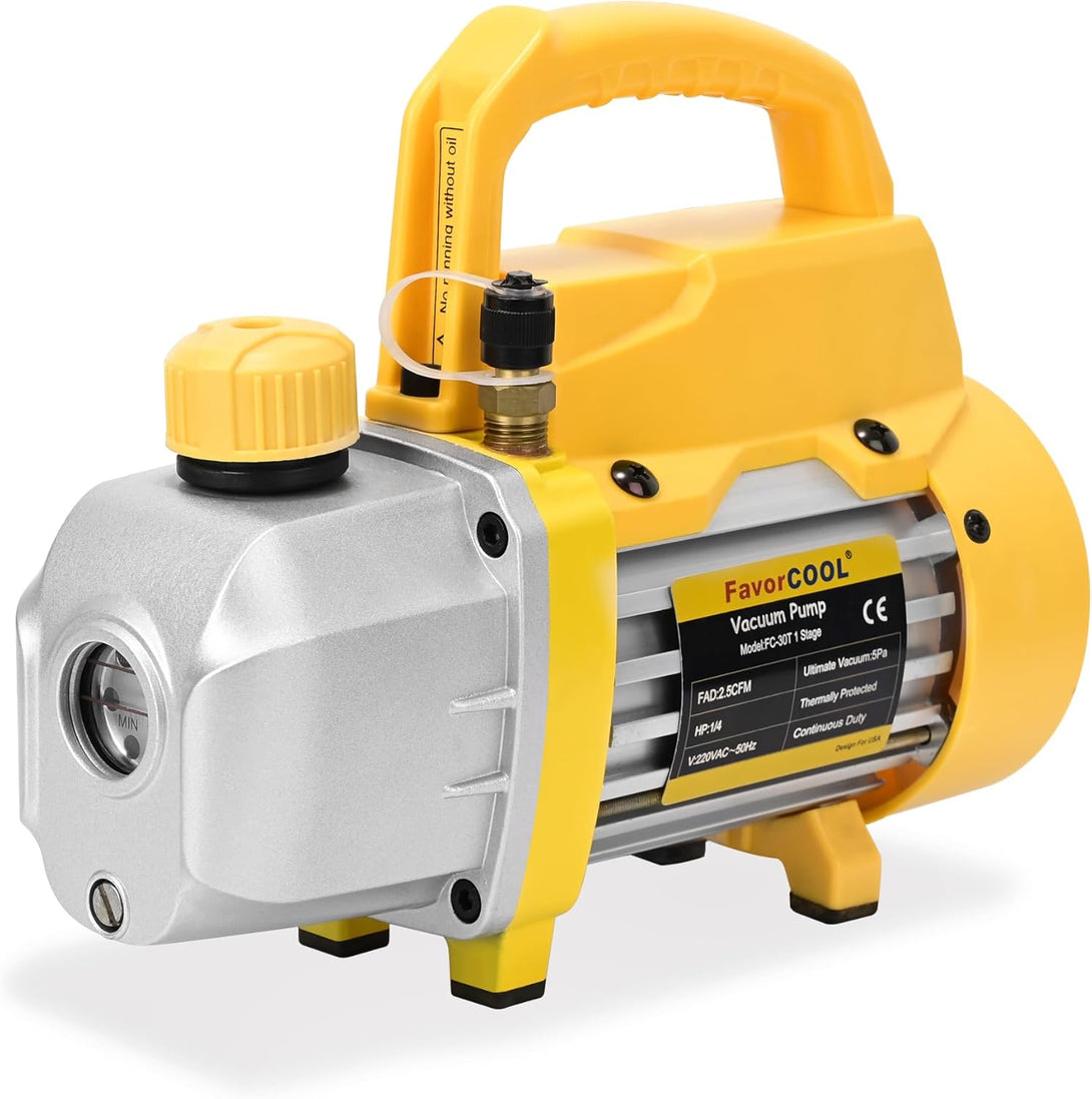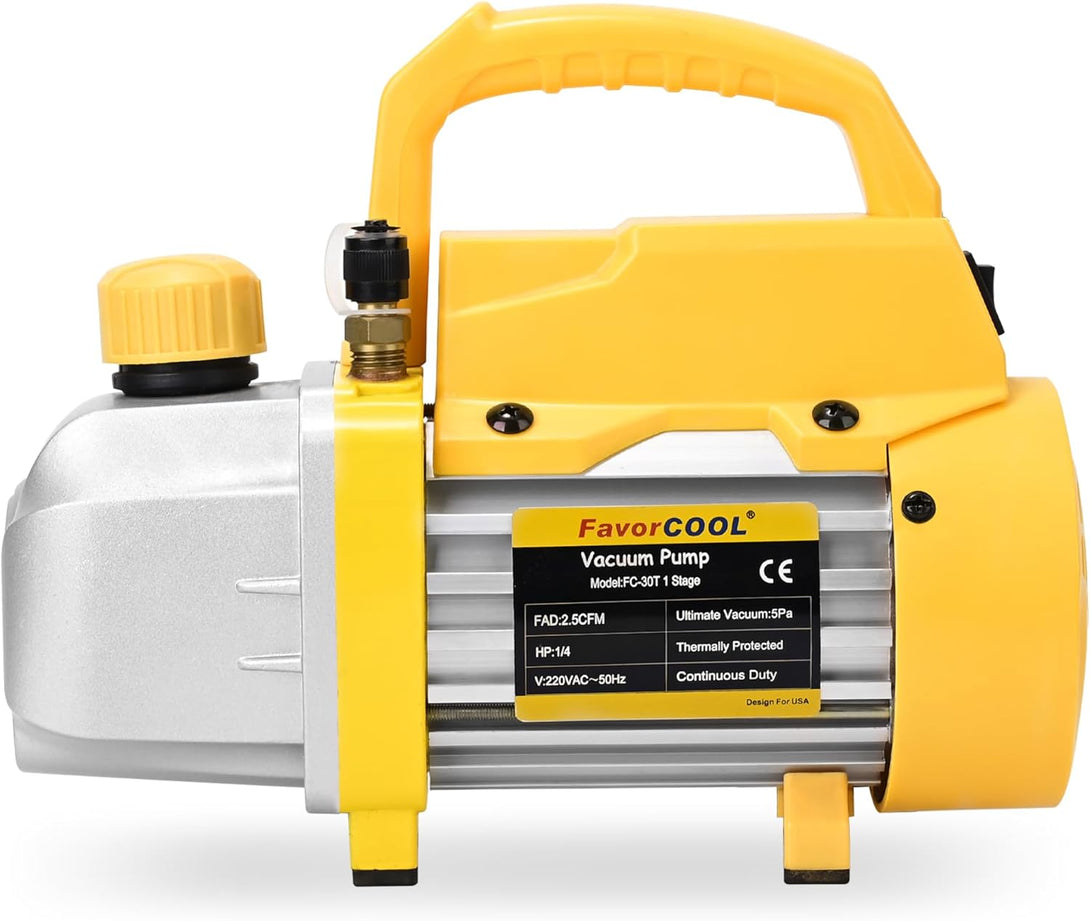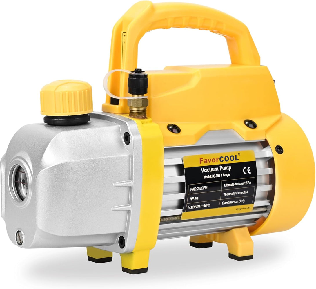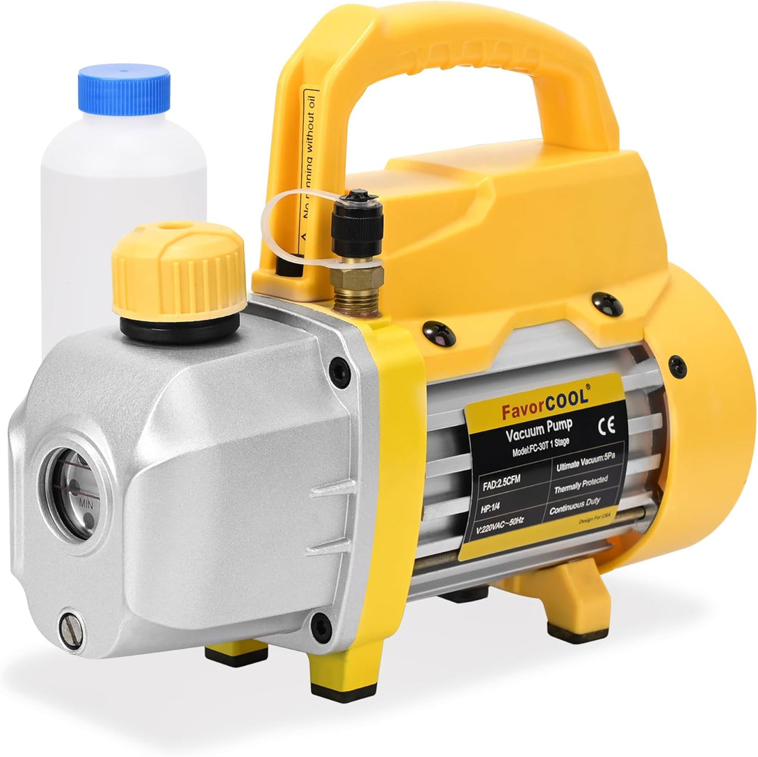 Rotary Vane Vacuum Pump: FavorCOOL single-stage 3 CFM rotary vane vacuum pump is powered by a 1/4 HP all copper motor to keep your HVAC servicing fast and easy. Its 3 cfm flow rate can draw your system down as low as 37.5 microns (5 Pa). Intake Ports: 1/4"Flare. Voltage/Frequency: 110/60HZ. Oil Capacity: 170 ml. SAFE & DURABLE: The lightweight cast aluminum structure effectively dissipates the heat generated during operation and resists chemical corrosion to ensure years of beneficial use; Its innovative design also prevents oil backflow and separates the exhaust from any oil vapors, limiting contamination and providing safer operation. Convenient To Operate: FavorCOOL single-stage rotary vane vacuum pump includes a sight glass and scale for easy monitoring of the pump's oil level and quality; The oil drain valve at the bottom ensures faster and more thorough emptying; The lightweight and sturdy handle keeps everything easily portable for transport or storage between jobs; and 1/4 inch ports allow fast and easy servicing of automotive and other low-tonnage R12, R22, R134a, R410a, and R502 systems Wide Application: FavorCOOL vacuum pump kit. Widely used in automotive air conditioning and HVAC work. Ideal for maintaining R22, R134a, and R410a air conditioning systems. As well as wine degassing, milking, medical treatment, food processing Guaranteed Satisfaction: We value customer satisfaction and want to ensure they fully understand how to use our products. Remember, a vacuum pump is a device that uses various methods to create and maintain a vacuum in a confined space. Vacuum pumps often malfunction if not operated properly. Please read the user manual and the six common vacuum pump faults and solutions carefully, its strong 1-year warranty and FavorCOOL's friendly 24/7 customer service give you peace of mind.